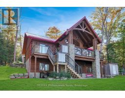 Welcome to family living on beautiful Jordan Lake in Highland Grove. This professionally landscaped Confederation log home sits on just under a half acre with 120 feet of sandy shoreline, offering both a shallow entry and deep, clean water perfect for swimming and summer fun. The property showcases true pride of ownership inside and out. The home offers over 2,400 sq. ft. of living space with a timber frame interior, vaulted ceilings, and an impressive stone propane fireplace as the centerpiece of the open-concept main floor. Families will appreciate the spacious primary suite on the main level, complete with a 4-piece ensuite, walk-in closet, and a walkout to the expansive 700 sq. ft. deck overlooking the lake. Additional highlights include custom live edge stairs with an iron railing, adding a unique touch of craftsmanship to the interior. The lower level is designed with family in mind, featuring a bright walkout rec room with a stone wood-burning fireplace, two additional bedrooms, a 3-piece bath, and a convenient laundry room - plenty of space for kids, guests, or extended family. With 3 bedrooms, 2.5 baths, and a backup generator, this four-season home offers comfort and peace of mind year-round. Located only 35 minutes from the village of Haliburton, you'll have access to schools, shops, restaurants, health services, arts and culture, and a welcoming community. A professionally landscaped, meticulously cared-for lakefront property like this is ready for its next family to enjoy for years to come. (id:35360)